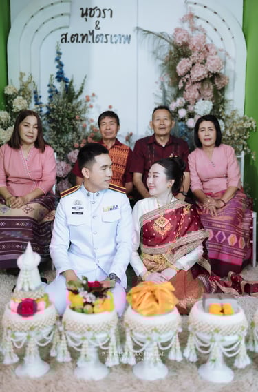 เบื้องหลังมีคุณพ่อคุณแม่และญาติผู้ใหญ่ร่วมอวยพร บรรยากาศจึงเต็มไปด้วยความรักและความผูกพันของสองครอบครัว